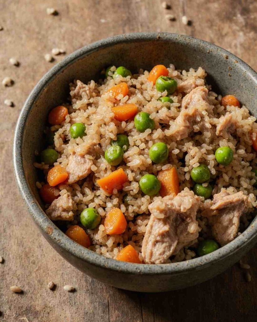 This one’s a crowd-pleaser. Simple, affordable, and makes a big batch you can store for days. Think of it as the “chicken and rice” for dogs—classic, filling, and guaranteed to score you extra licks.