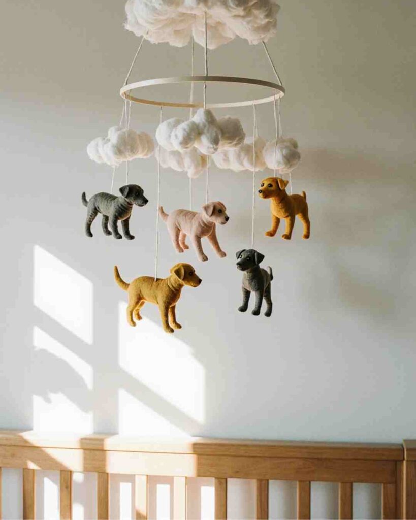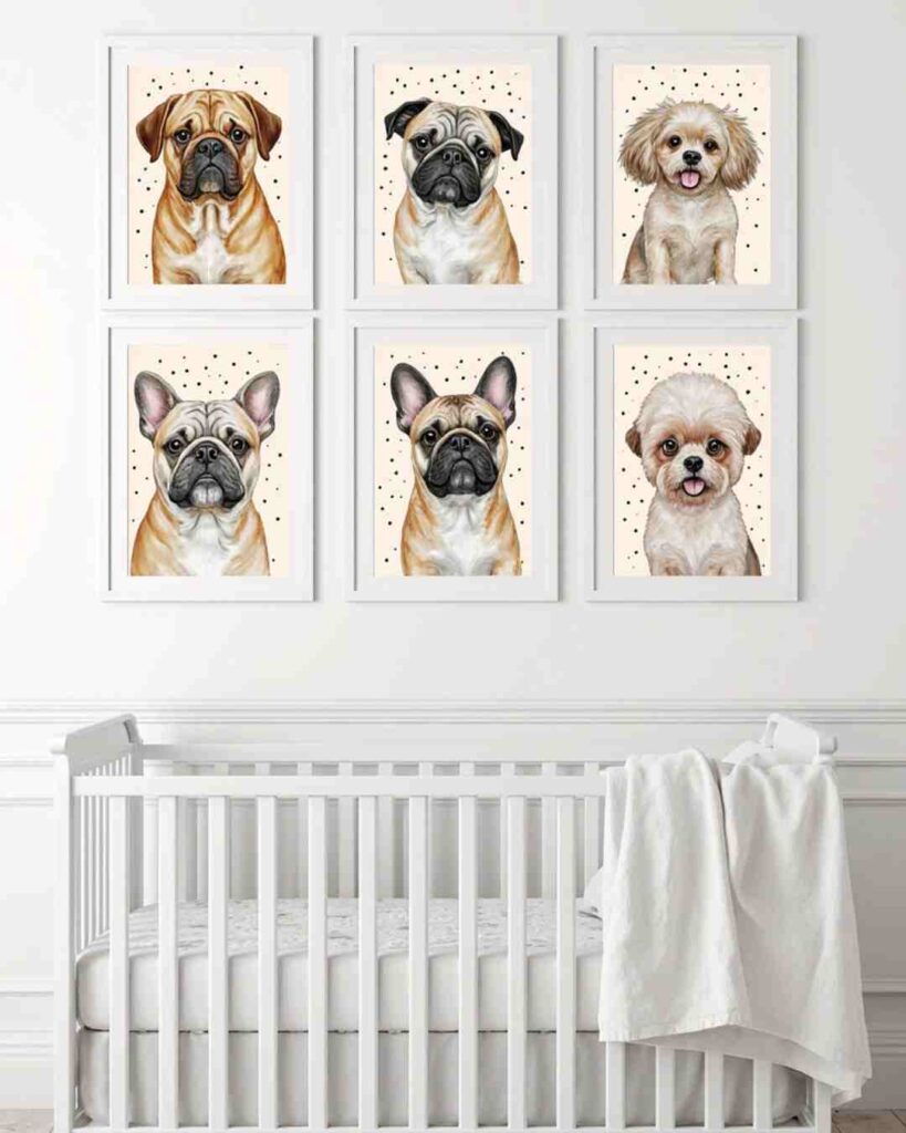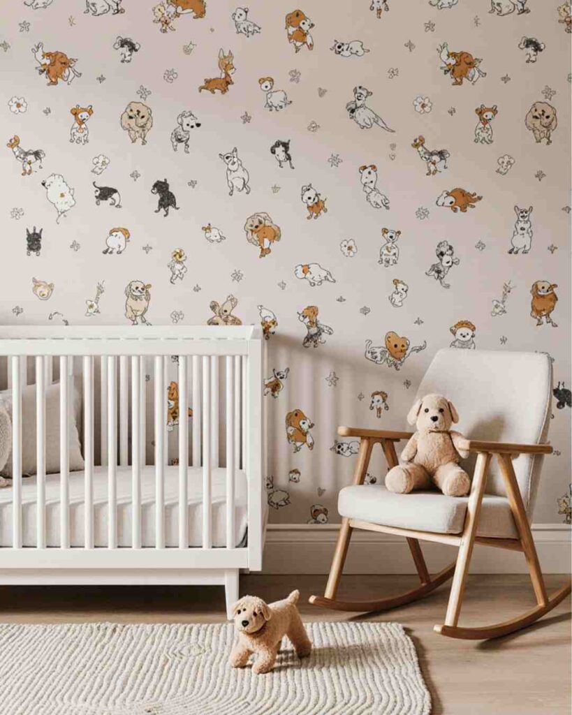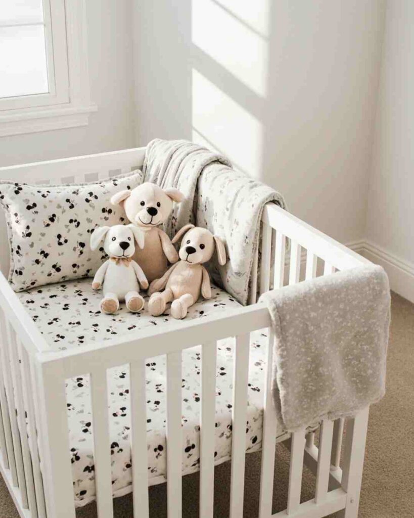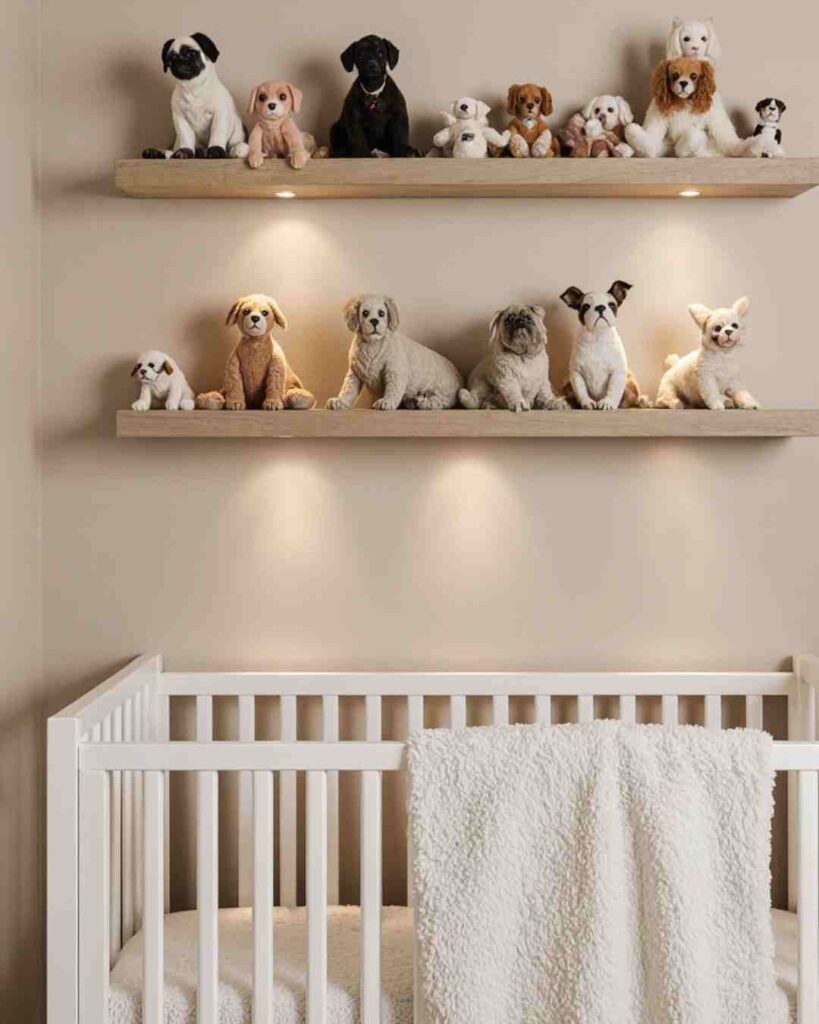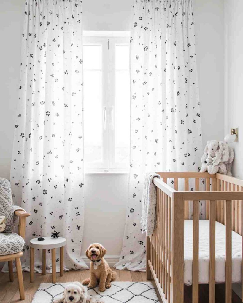 Don’t go wild here—soft, subtle dog prints on crib sheets or blankets feel more elegant than loud patterns.
