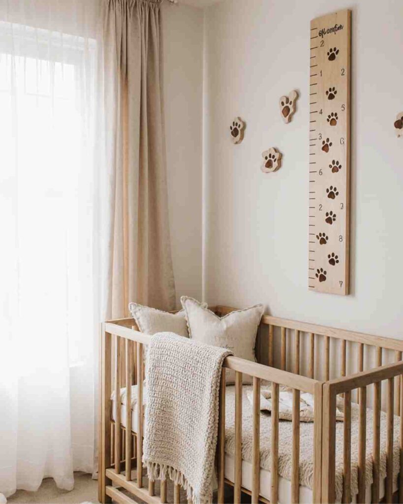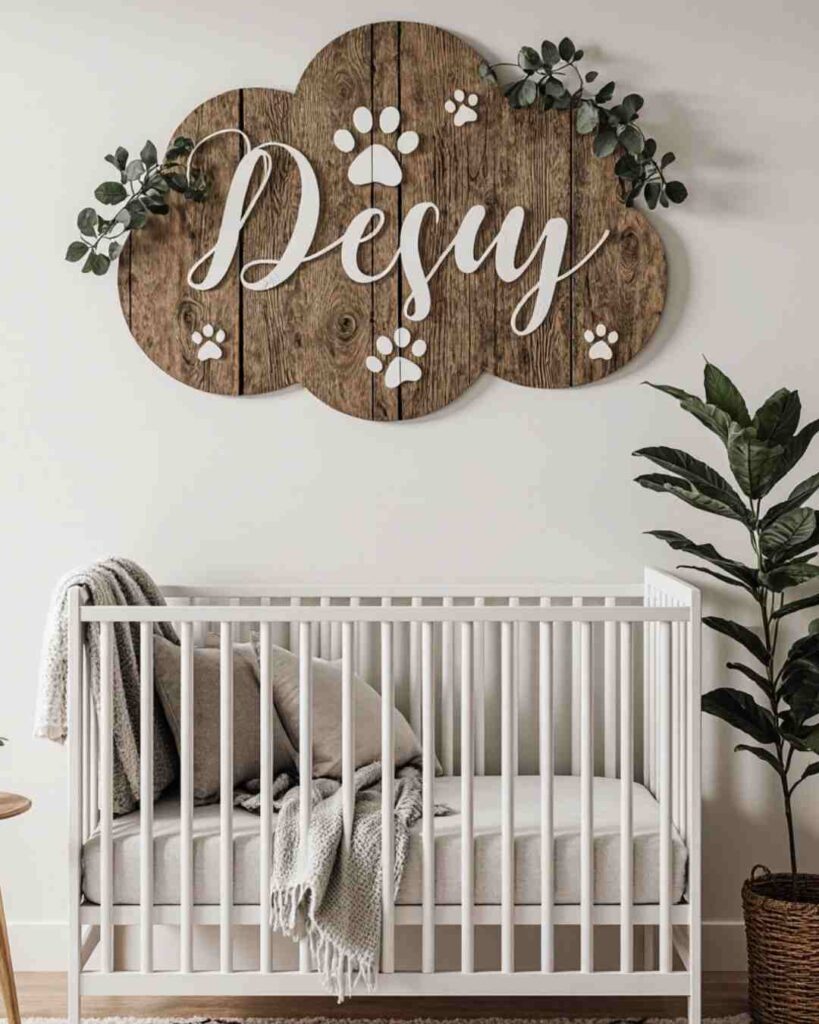 Want the nursery to feel personalized? A custom wooden name sign featuring dogs adds warmth and character.
