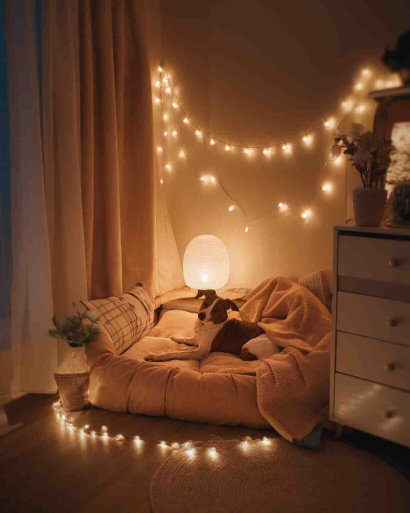 Lighting changes everything. If your dog reacts to loud noises or new environments, a calming light setup can create the perfect retreat.