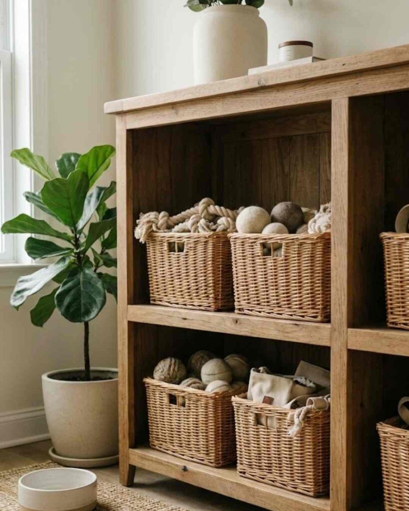I built a small crate cabinet from reclaimed wood. It stores leashes, treats, and grooming tools without looking cluttered. If you like DIY setups like this, you’ll love our DIY dog room storage & prep ideas here: