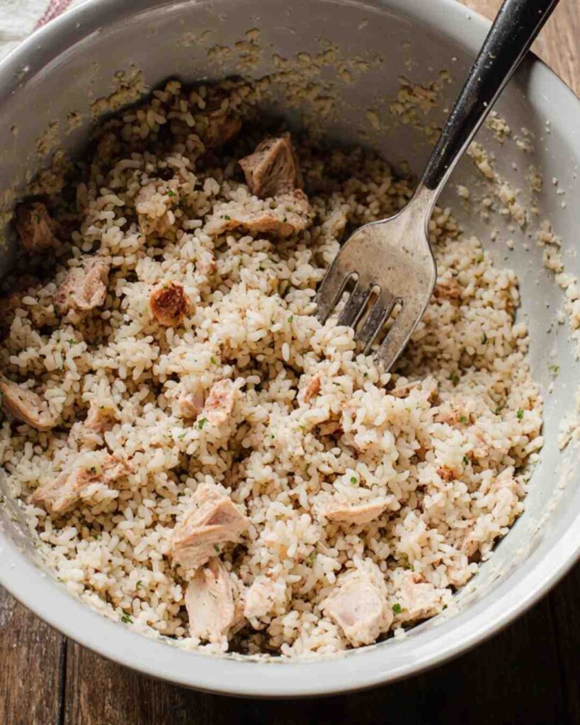 Add the shredded chicken and rice to a large bowl. Break up any clumps with a fork. You want a fine, even mix so the balls don’t crumble later.