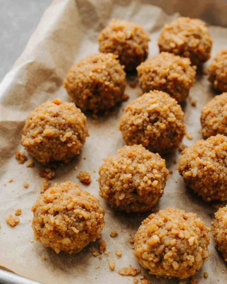 Line a baking sheet with parchment paper. It prevents sticking and saves you from chiseling baked rice off metal. Space balls an inch apart for airflow.