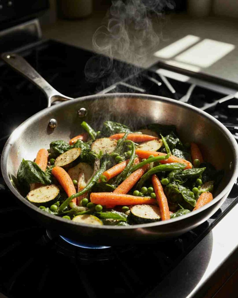 Heat the olive oil in a large pan over medium heat. Add the carrots first and sauté for 3–4 minutes—they’re the toughest. Then add green beans, peas, and zucchini. Stir and cook for another 4–5 minutes, just until everything softens.