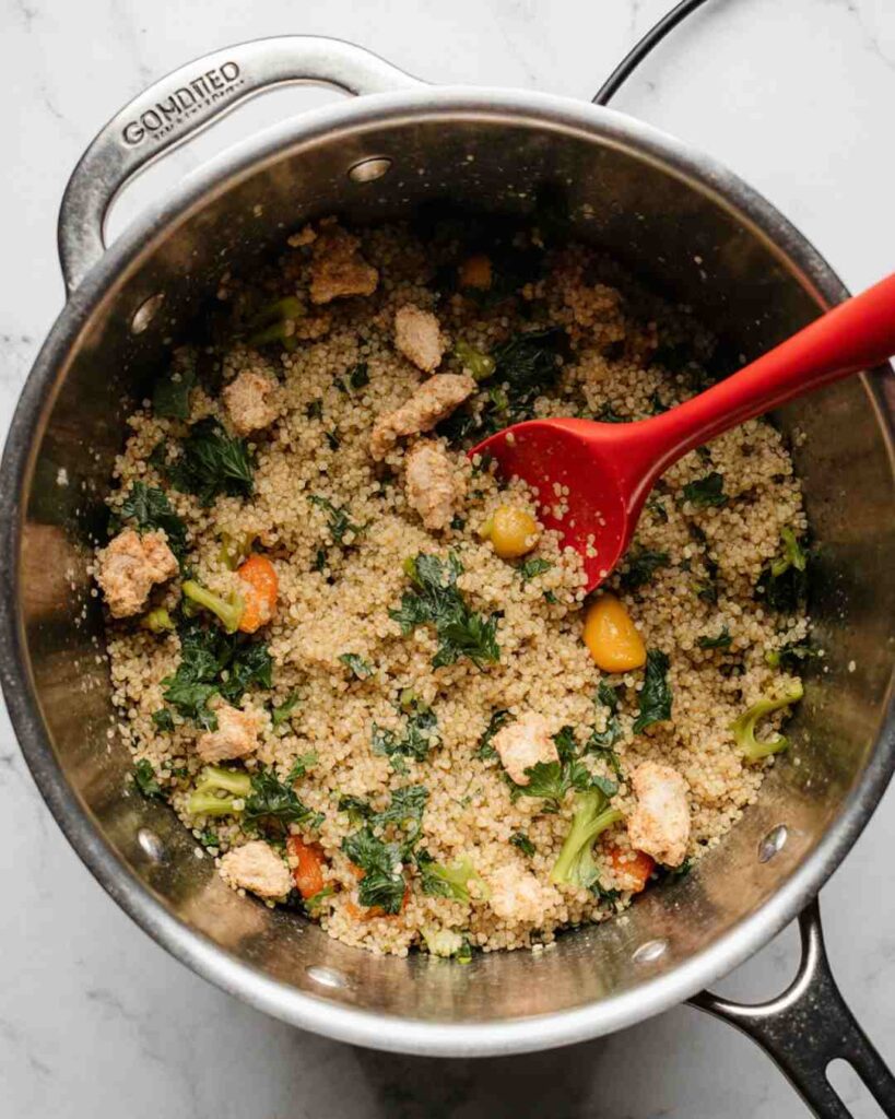 In a large mixing bowl, combine the cooked quinoa, sautéed veggies, and protein. Stir well so every scoop has a balance of grains, veggies, and meat.